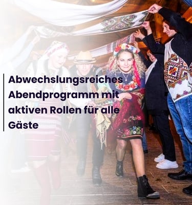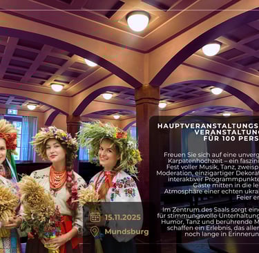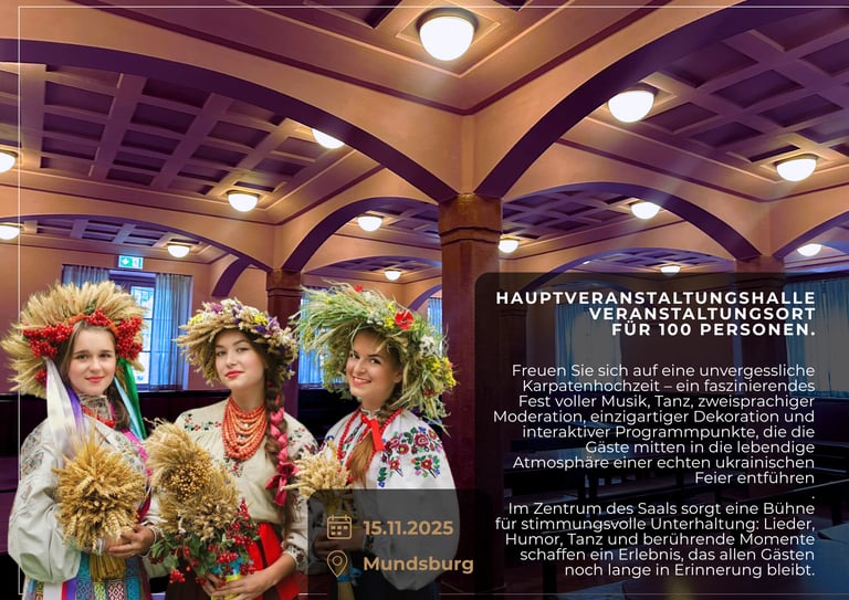 Kulturelle Bedeutung: Das Event symbolisiert ukrainische Tradition, Kreativität und Zusammenhalt. Erleben Sie die Kultur und Bräuche ukrainischer Hochzeiten mit Liedern, Tänzen, festlicher Kleidung und Ritualen – ein lebendiger Raum für Austausch und gemeinsames Feiern. Nur 100 exklusive Sitzplätze – sichern Sie sich jetzt Ihren Platz.